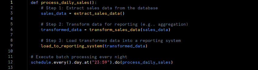 • Example: Consider a retail company that processes sales data at the end of each day to generate daily sales reports. Here’s a pseudo-code example of batch processing:
