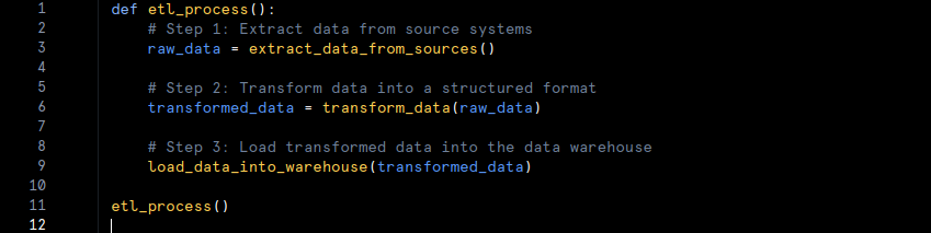 • Example: In an ETL process, a company might extract customer data from multiple sources, clean and format it, and then load it into a data warehouse for reporting.