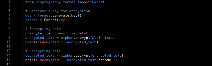 • Example: For instance, if a company needs to secure customer information such as Social Security numbers, it can use encryption. In Python, the ‘cryptography‘ library can be used for this purpose: