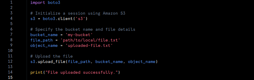 Here is a simple Python example showing how to upload a file to AWS S3 using the boto3 library: