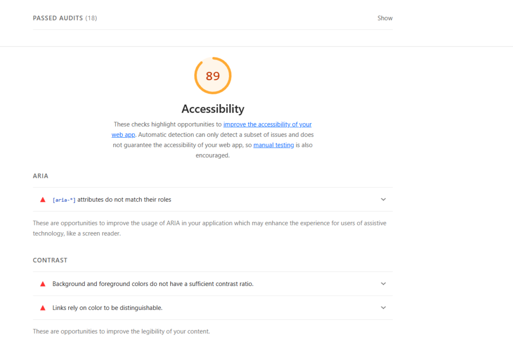 These audits scrutinise whether your website is easily accessible to all users, including those with disabilities. It checks elements like colour contrast, correct use of headings, and appropriate labelling. The Lighthouse Accessibility section also provides a list of “Additional items to manually check.” This is because it isn’t possible to automate a check of all of the relevant benchmarks.