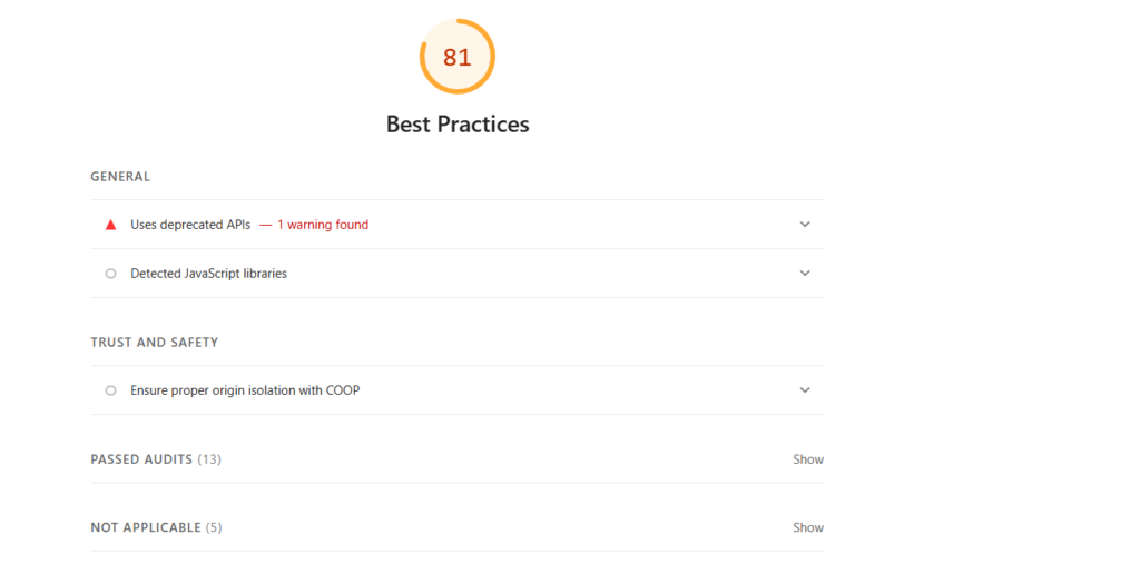 Google Lighthouse identifies opportunities to apply web development best practices, helping to prevent potential issues that could harm your site’s security or performance.