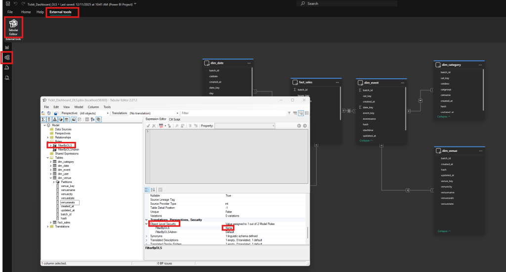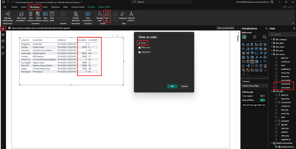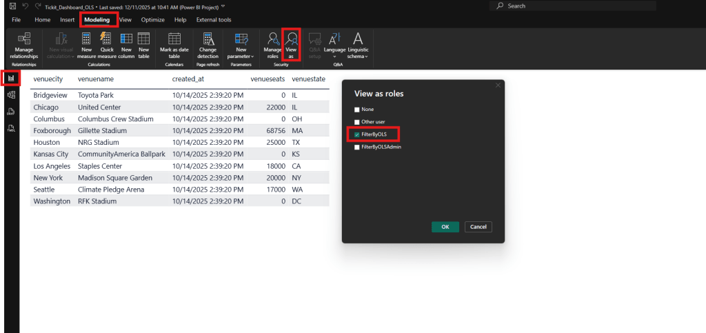 - In the dim_venue table -> choose venueseats column -> In Object Level Security, FilterByOLS choose ‘None’ as the screenshot below