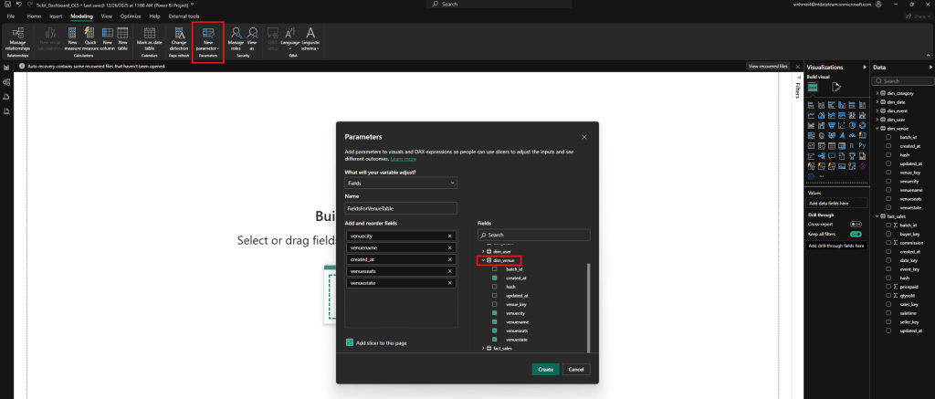 When the configuration is done and click on ‘Create’ button, you will see a new table named ‘FieldsForVenueTable’ has been added to our semantic model. I then deleted the slicer since we don’t need it.
