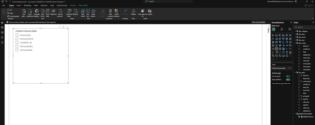 In the screenshot above, focusing on the right-hand side of the Data pane, you will notice that the ‘venueseats’ and ‘venuestate’ columns no longer appear in the dim_venue table. In other words, these columns have been removed from the semantic model.