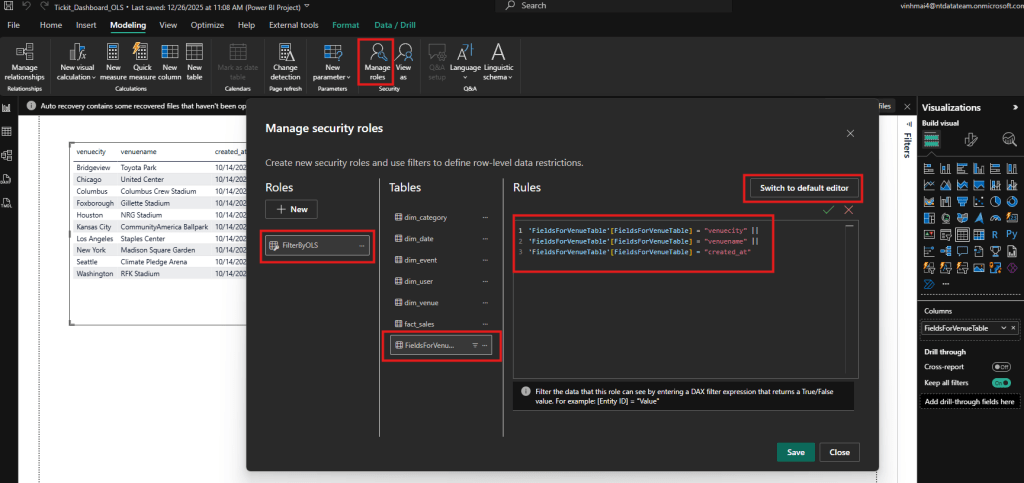 Finally, now when we view the report through the role ‘FilterByOLS’ we only see 3 columns: venuecity, venuename, created_at. The result is as the screenshot below, notice my red borders, you see that the ‘venueseats’ and ‘venuestate’ has been removed to the dim_venue in semantic model also.