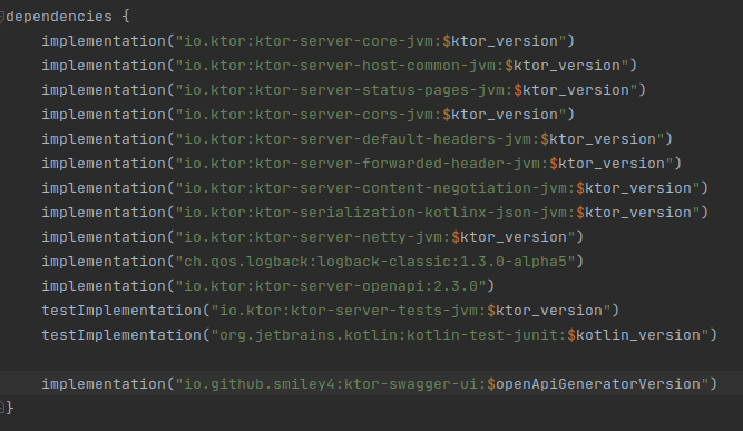 Before diving into the code, make sure you have set up your project’s dependencies correctly. In your build.gradle.kt file, including the required dependencies for Ktor, Swagger UI, and Kotlin Serialization.
