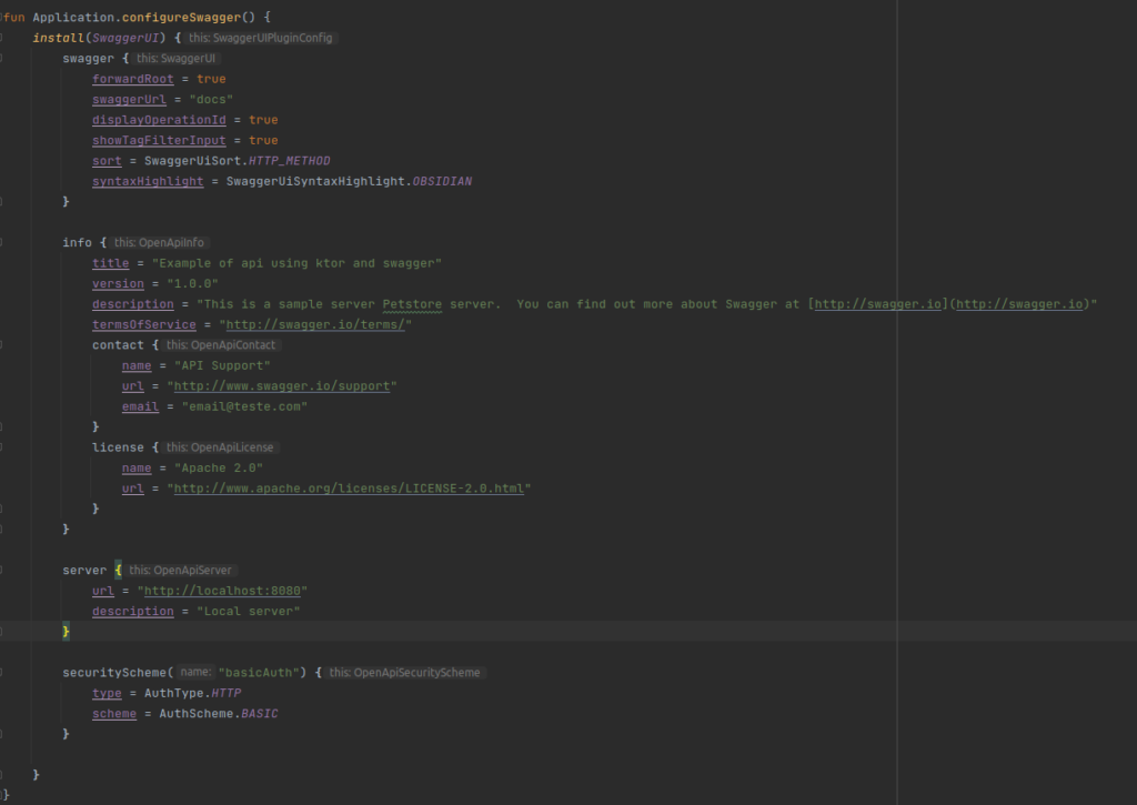 Open your Swagger.kt file located in the plugins directory. This is where the magic happens. The configureSwagger function is where you’ll define the appearance, information, and security of your Swagger documentation.