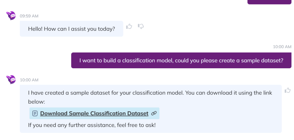 Data scientists can download the sample dataset to review and ask BonBon to refine the data if needed. After that, BonBon can help visualize the relationship between features (columns) in the data.