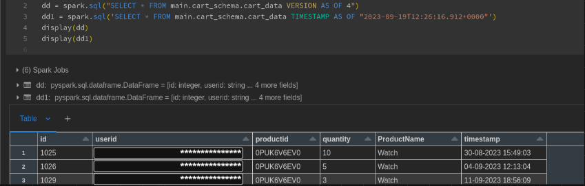 dataframe = spark.sql('SELECT * FROM main.cart_schema.cart_data TIMESTAMP AS OF "2023-09-19 12:26:16.912"')