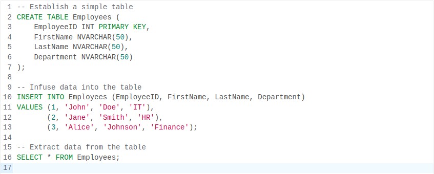 This example illustrates creating a table called “Employees” with columns for employee details, adding data into the table, and retrieving the data. Azure SQL Database supports standard SQL syntax, facilitating easy interaction with existing SQL code.