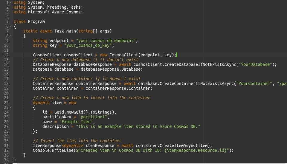 This code connects to your Azure Cosmos DB account, creates a database if it doesn’t exist, creates a container within that database if it doesn’t exist, and then inserts a document (item) into the container. Make sure to replace `”your_cosmos_db_endpoint”` and `”your_cosmos_db_key”` with your actual Cosmos DB endpoint and key.