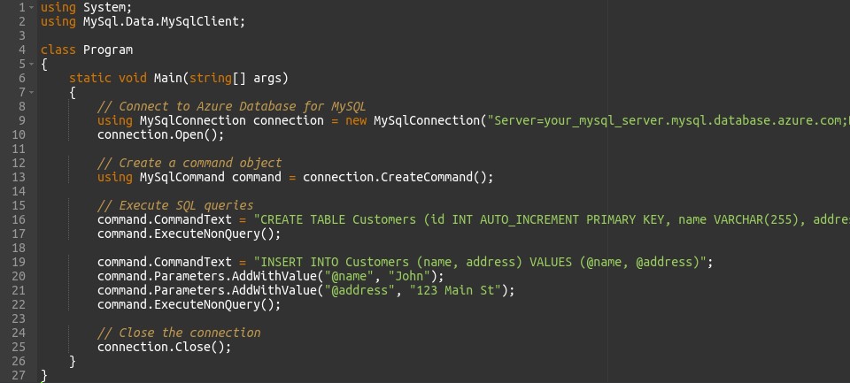 This example establishes a connection to an Azure MySQL server, creates a table named “Customers”, inserts a record into the table, and closes the connection. Adjust the connection parameters and SQL queries to match your Azure MySQL server configuration and database schema.