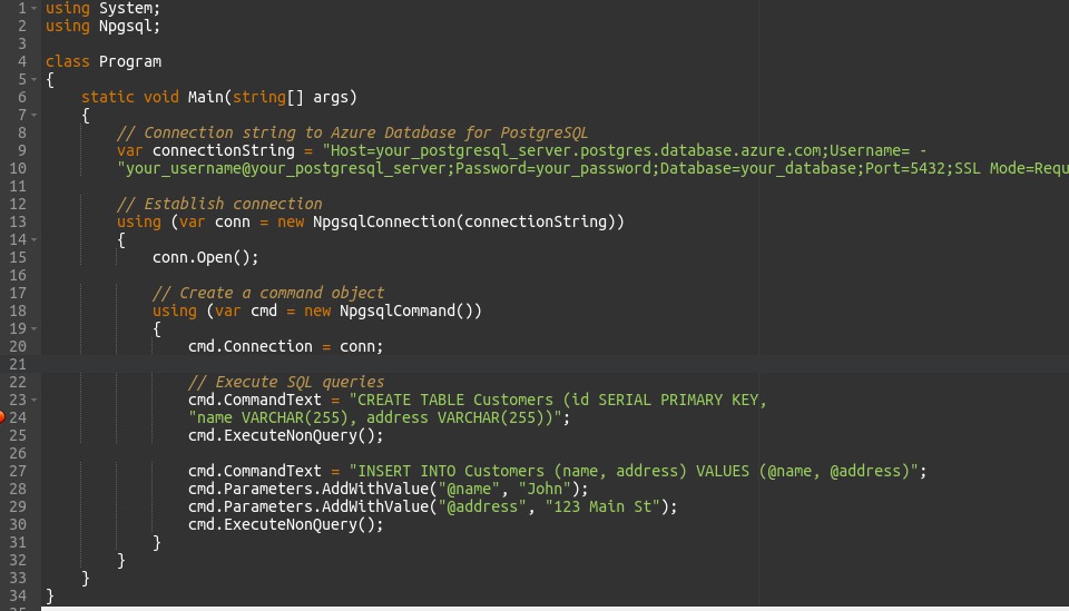This code establishes a connection to an Azure PostgreSQL server, creates a table named “Customers”, inserts a record into it, and then closes the connection. Adjust the connection parameters and SQL queries to match your Azure PostgreSQL server configuration and database schema.