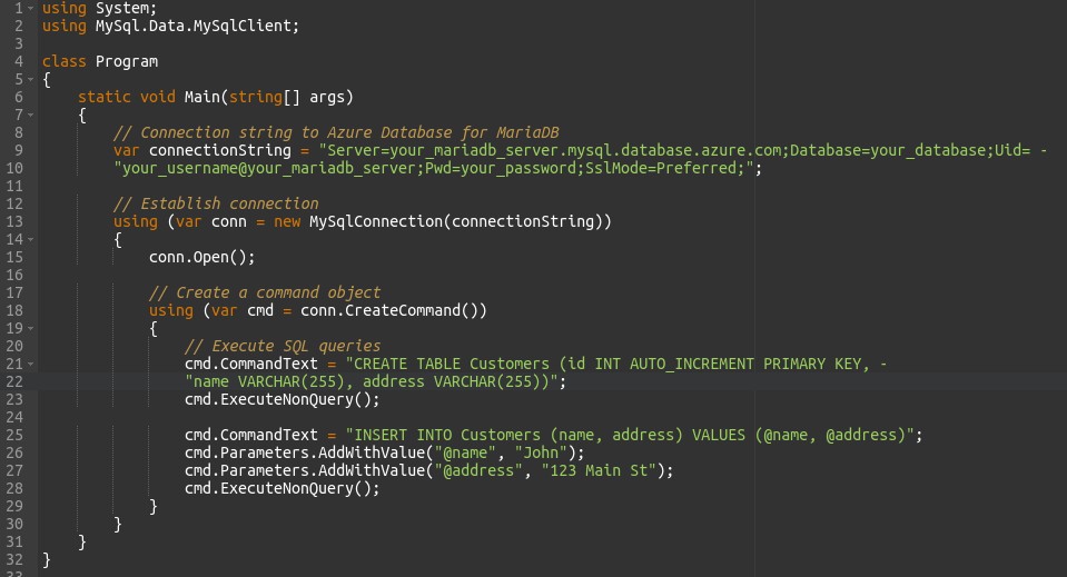 This code establishes a connection to an Azure MariaDB server, creates a table named “Customers”, inserts a record into it, and then closes the connection. Adjust the connection parameters and SQL queries to match your Azure MariaDB server configuration and database schema.