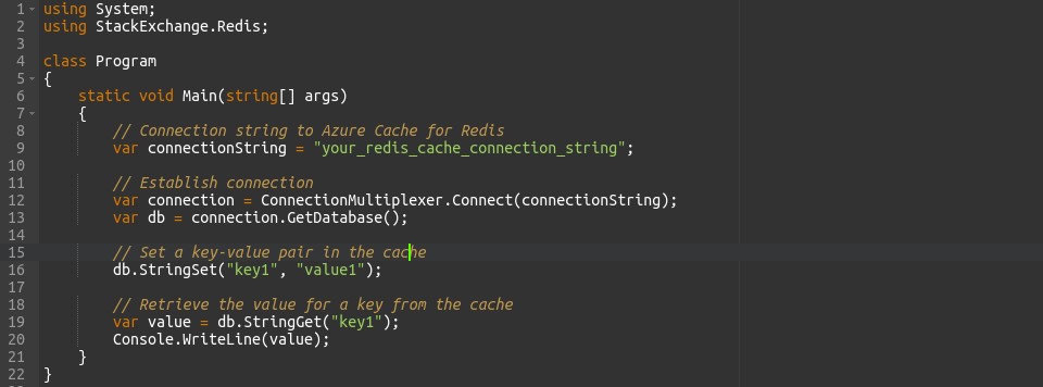 This code establishes a connection to an Azure Cache for Redis instance, sets a key-value pair in the cache, retrieves the value for a key, and then closes the connection. Replace “your_redis_cache_connection_string” with your Azure Cache for Redis connection string. Adjust the key-value pair and operations as needed for your application.