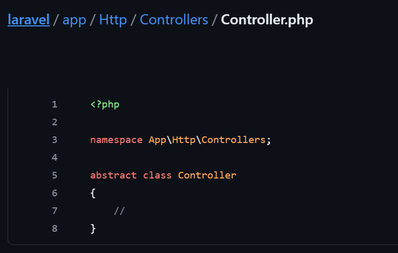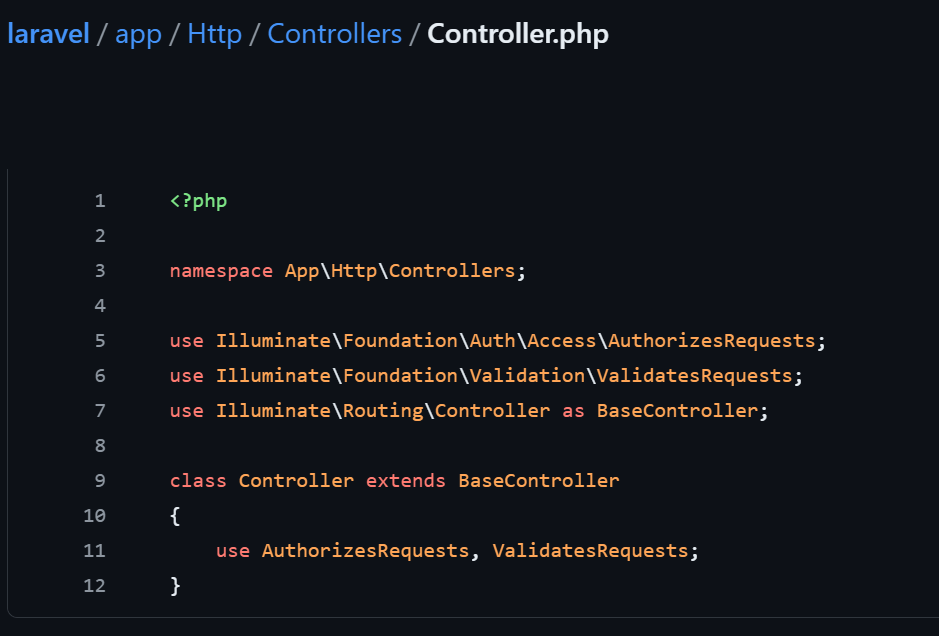 The base controller now contains in new simplified abstract structure. It no longer extends Laravel’s internal Controller class. The AuthorizesRequests and ValidatesRequests traits were removed. We can include these traits in our desired individual controller classes.