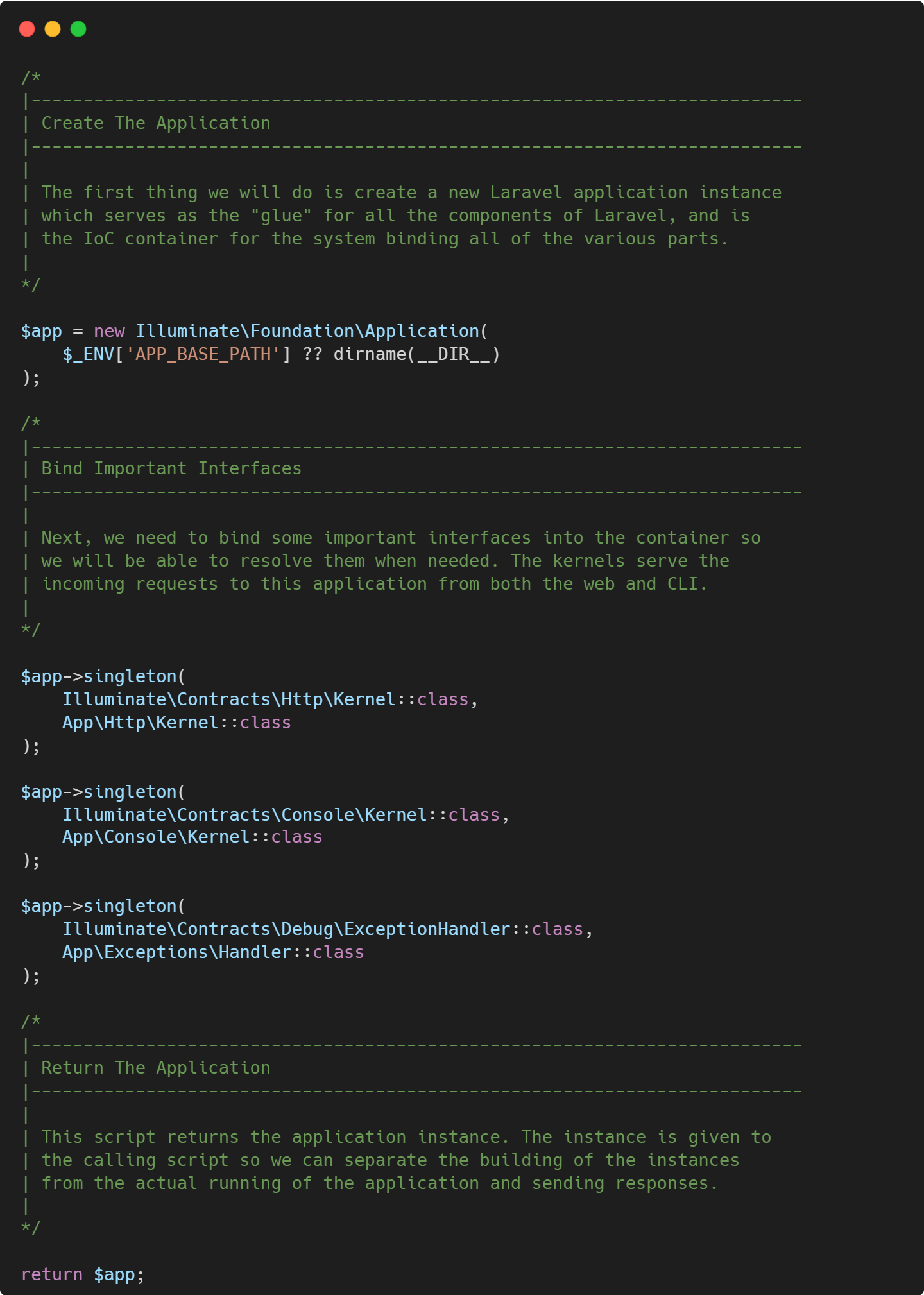 The bootstrap/app.php  file has been upgraded as a code-first application configuration file. So that, it can unify a variety of high-level application behavior settings that were previously scattered throughout your application’s file structure. From this file, you may now customize your application’s routing, middleware, service providers, exception handling, and more.
