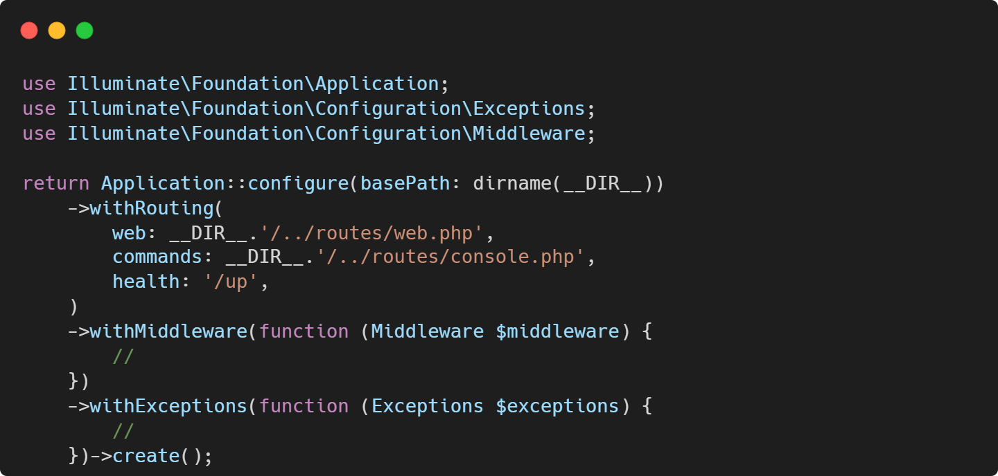 Similar to routing and middleware, you can now customize exception handling from your application’s bootstrap/app.php file instead of using a separate exception handler class, reducing the overall number of files in a new Laravel application.