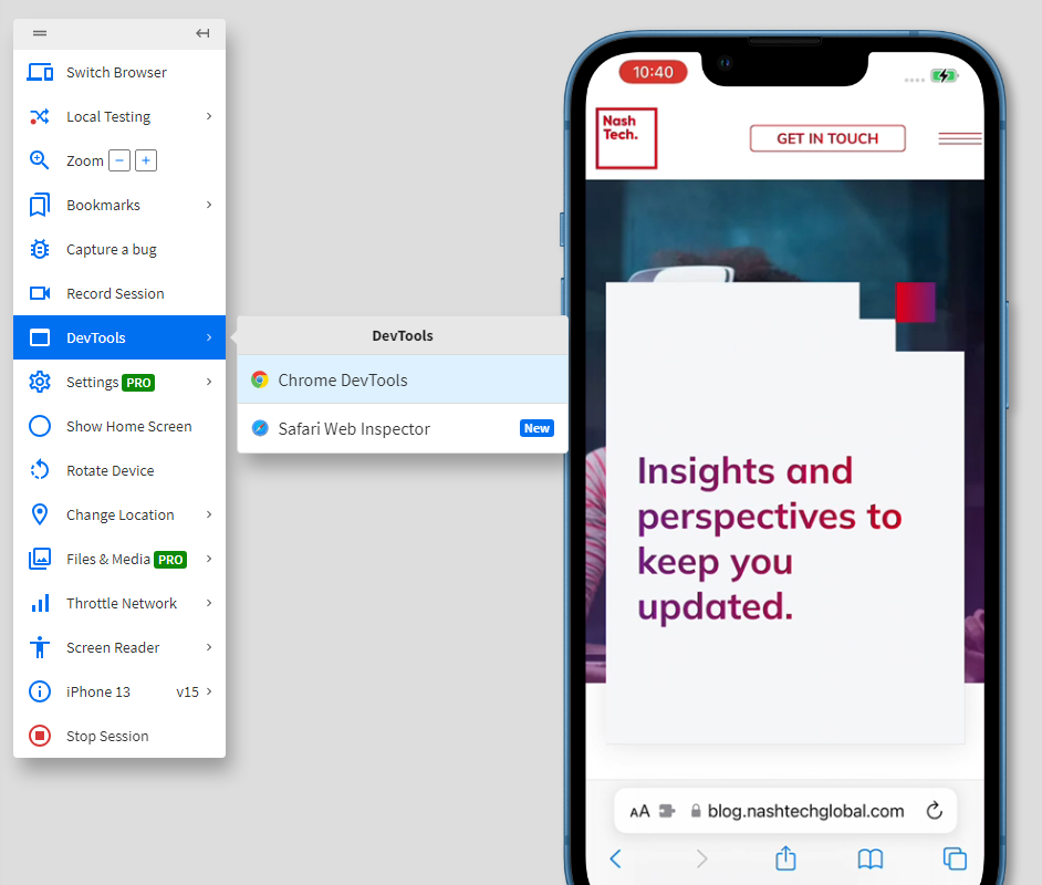 - Browser Developer Tools: Most modern web browsers offer built-in developer tools enabling simulation of diverse devices and screen sizes. For instance, in Chrome, access Developer Tools (Ctrl + Shift + I or Cmd + Opt + I on Mac), click on the device icon in the toolbar, and select from preset devices or customize screen dimensions. Detailed instructions are available in the blog, “Use Chrome DevTools for Web Application Testing – NashTech Insights”.