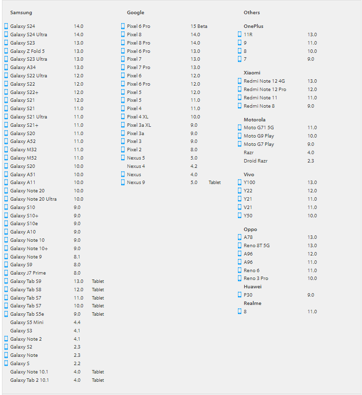 - For Android devices: Samsung (Mobile & Tablet devices), Google (Mobile & Tablet devices), OnePlus, Xiaomi, Vivo, Motorola, Oppo, Huawei, Realme.