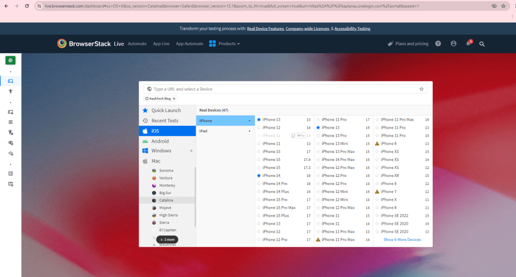 - Start the Testing Session: Select browser of device to initiate the testing session. BrowserStack will launch a virtual environment that replicates the selected device and browser configuration.