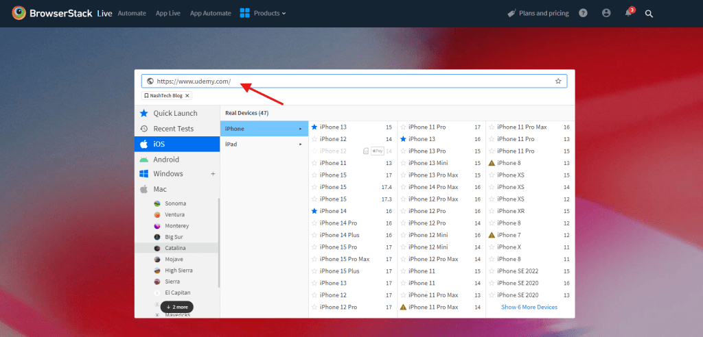 - Select the Device and Browser: In the dashboard, you’ll see options to choose the device, operating system, and browser combination you want to test your website on. BrowserStack offers a wide range of devices, browsers, and operating systems to choose from. You can based on test strategy or using your traffic analytics data to find the right devices.