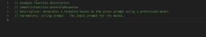 - Semantic Function: This function leverages the connector to generate responses based on user inputs. It acts as an intermediary that processes the input, sends it to the pretrained model, and handles the output.