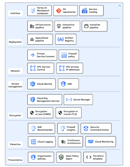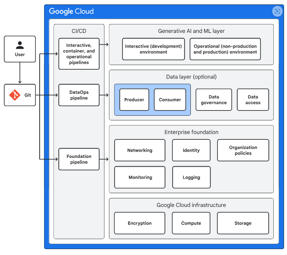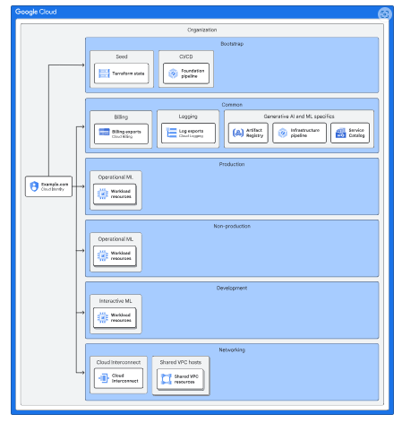 - Enterprise Foundation: Provides a baseline set of resources including identity management, networking, logging, monitoring, and deployment tools, enabling seamless adoption of Google Cloud for AI workloads.