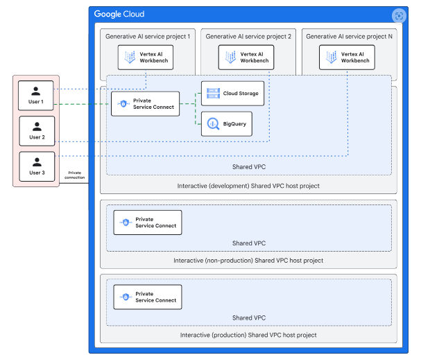 The blueprint utilizes the Shared VPC network established in the enterprise foundation blueprint. In the interactive (development) environment, Vertex AI Workbench notebooks are deployed within service projects, allowing on-premises users to access these projects via the private IP address space in the Shared VPC network.