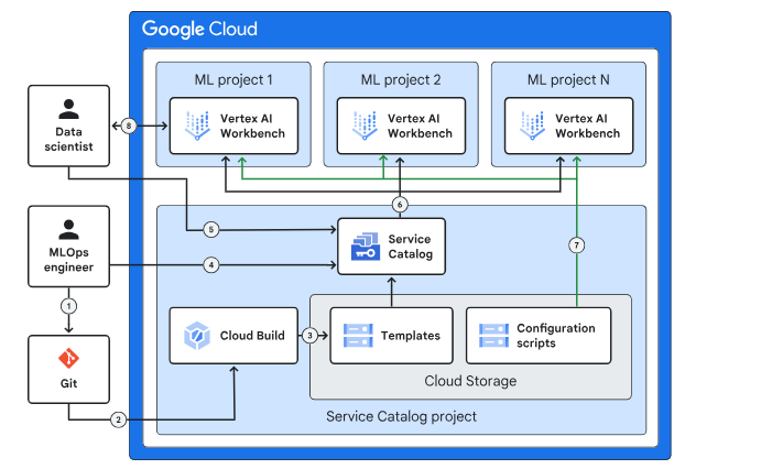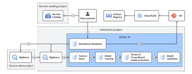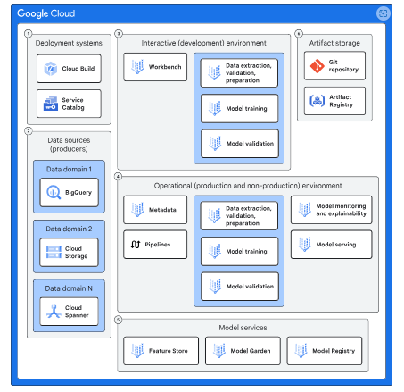 Services like Service Catalog and Cloud Build facilitate the deployment of Google Cloud resources in the interactive environment. Cloud Build also handles the deployment of these resources and model-building workflows into the operational environment.