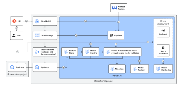 - Artifact Registry: Stores containers utilized by pipelines in the operational environment to manage different stages of model development.