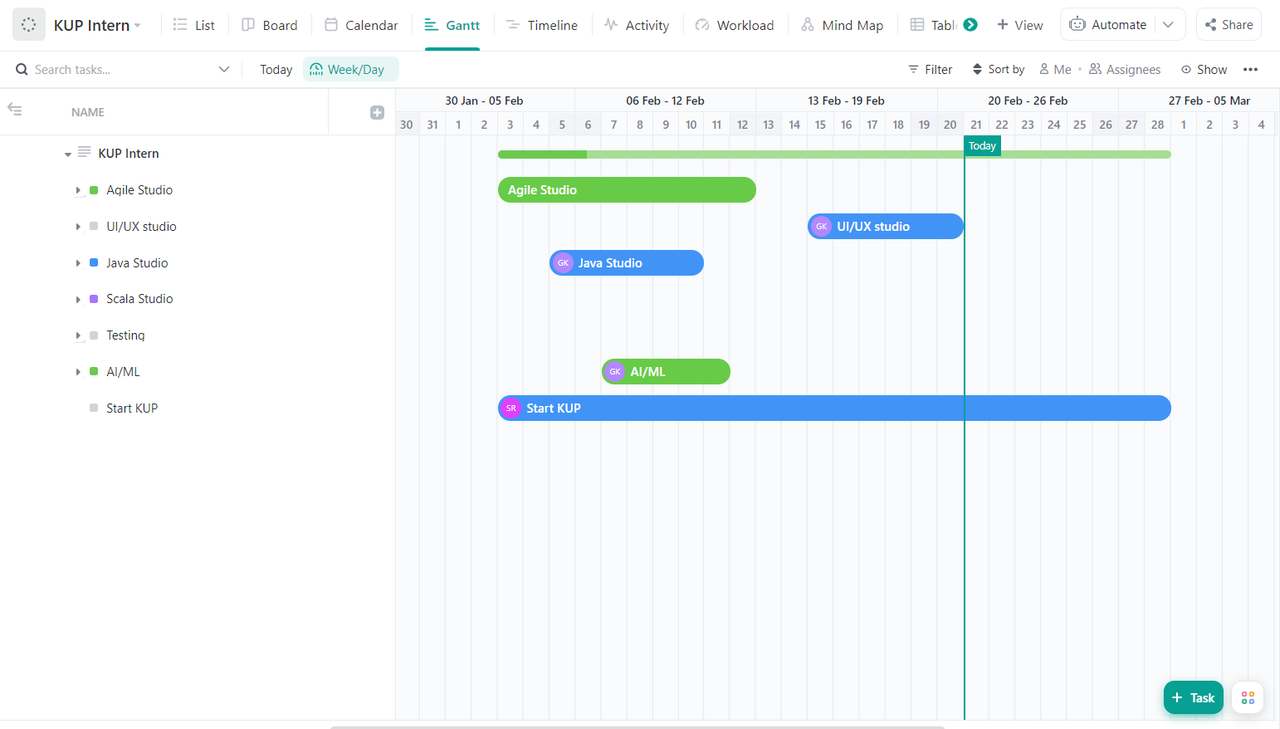 - Dependencies: Light gray lines that connect tasks that need to happen in a certain order