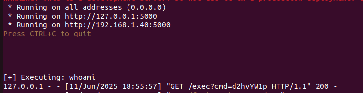 - whoami is sent to localhost:5000 and executed.